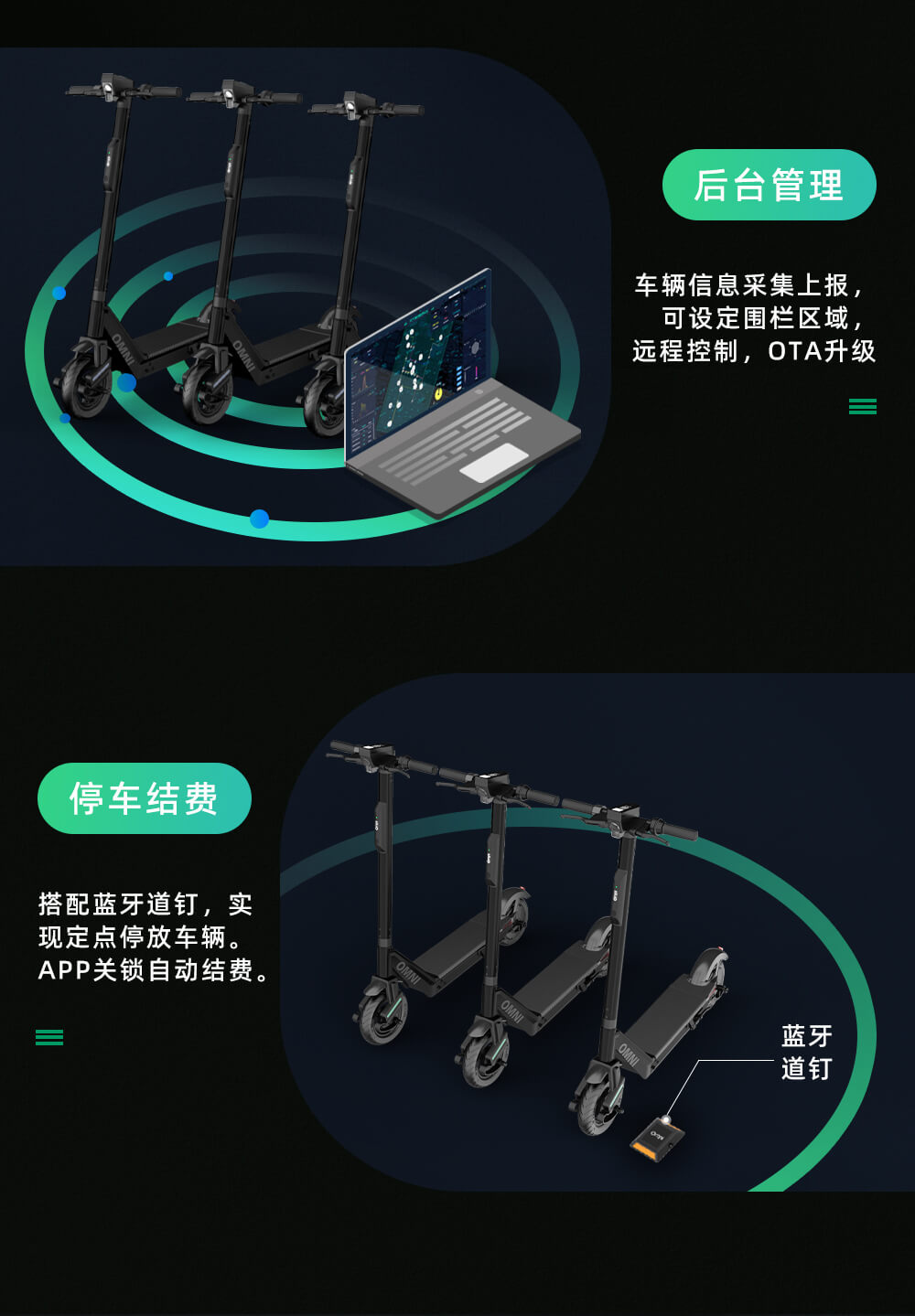 歐米智能共享滑板車半嵌入式IOT 雙頻GPS+慣導技術 L1/L5 GNSS雙頻全球衛星定位技術,有效提高接收機位的定位精準度,抑制路徑效應的影響,并能很好的提高抗干擾能力,4G通訊技術,開鎖,上傳數據更快更精準,結費時自動鎖車,環保塑膠材料,外表磨砂質感,更耐磨,耐沖擊,耐腐蝕,耐高溫,延長產品使用壽命,歐米智能共享滑板車解決方案在全球的校園,城市以及景區都擁有大量成功的案例